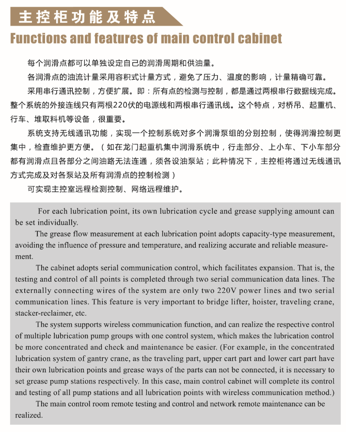 1.控制系统:是润滑系统的指挥中间,控制高压润滑泵即油站的启停,电磁给油器的运行,现场信息收集,以及对每个润滑点的润滑状态监控,时间与供油量的显示和调节。其相应的声光报警系统还可以做到遇到故障及时报警。