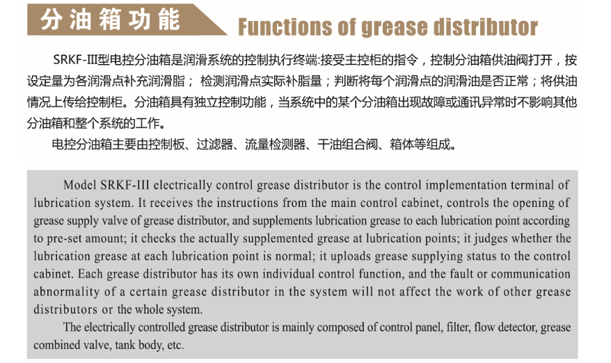 1.控制系统:是润滑系统的指挥中间,控制高压润滑泵即油站的启停,电磁给油器的运行,现场信息收集,以及对每个润滑点的润滑状态监控,时间与供油量的显示和调节。其相应的声光报警系统还可以做到遇到故障及时报警。