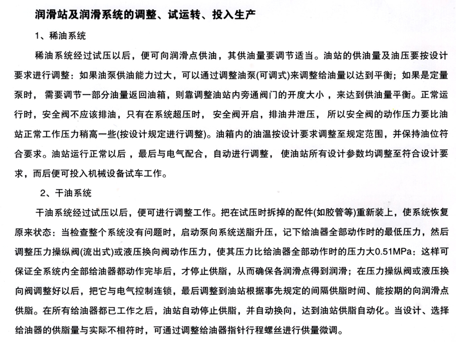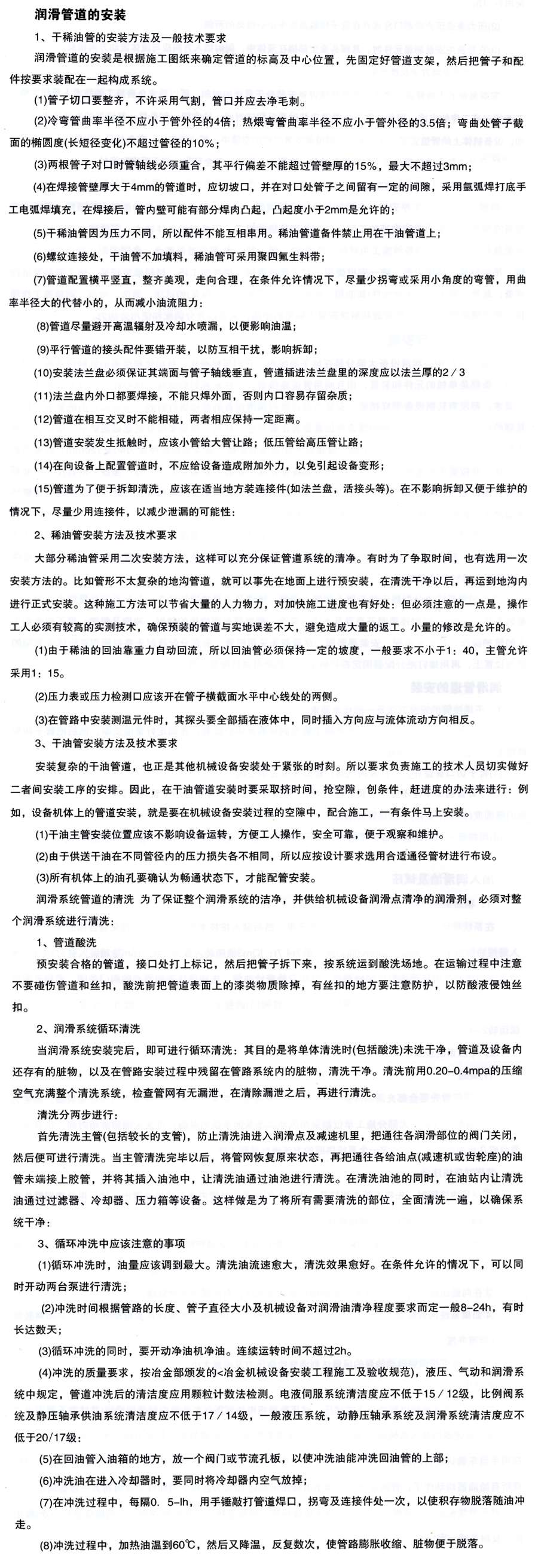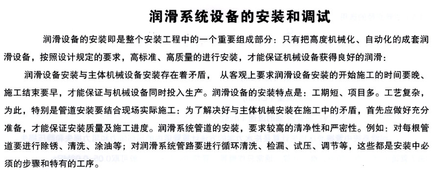 在图纸审查的基础上,编制出润滑设备及管道的安装施工工艺图纸:图纸中应包括按设计要求提出的中心线位置、标高、安装测量方法及技术质量要求标准、施工中注意事项及检查测量记录表等。对工程较小、较简单的,可以只编写质量记录表。此外,还要编写出安装技术规程、安全技术措施、施工用材料备品计划等有关施工技术资料