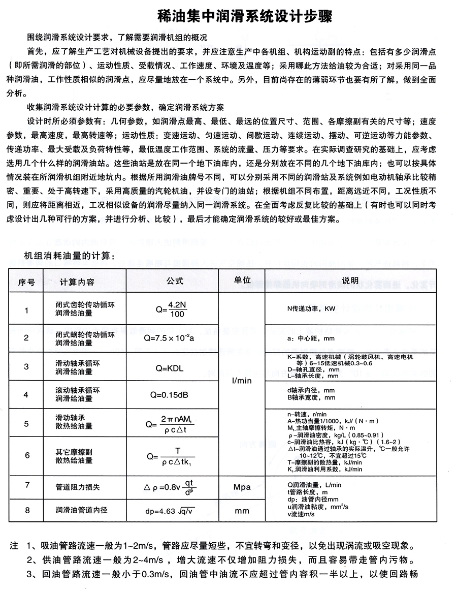首先,应了解生产工艺对机械设备提出的要求,并应注意生产中各机组、机构运动副的特点:包括有多少润滑点,即所需润滑的部位)、运动性质、受载情况、工作速度、环境及温度等;采用哪此方法给油较为合适;对采用同一品种润滑油,工作性质相似的润滑点,应尽量地放在一个系统中。另外,目前尚存在的薄弱环节也要有所了解,做到全面分析。收集润滑系统设计计算的必要参数,确定润滑系统方案,设计时所必须参数有:几何参数,如润滑点最高、最低、最远的位置尺寸、范围、各摩擦副有关的尺寸等;速度参数,最高速度,最高转速等;运动性质:变速运动、匀速运动、间歇运动、连续运动、摆动、可逆运动等力能参数、传递功率、最大受载及负荷特性等,最低温度工作范围、系统的流量、压力等要求。在实际调查研究的基础上,应考虑选用几个什么样的润滑油站。这些油站是放在同一个地下油库内,还是分别放在不同的几个地下油库内;也可以按具体情况装在所润滑杋组附近地坑内。根据所用润滑油牌号不同,可以分别采用不同的润滑站及系统例如电动机轴承比较精密、重要、处于高转速下,采用高质量的汽轮机油,并设专门的油站;根据机组不同布置,距离远近不同,工况性质不同,则应将距离相近,工况相似设备的润滑尽量纳入同一润滑系统。智能润滑系统在全面考虑反复比较的基础上(有时也可以同时考虑设计出几种可行的方案,并进行分析、比较), 最后才能确定润滑系统的较好或最佳方案。